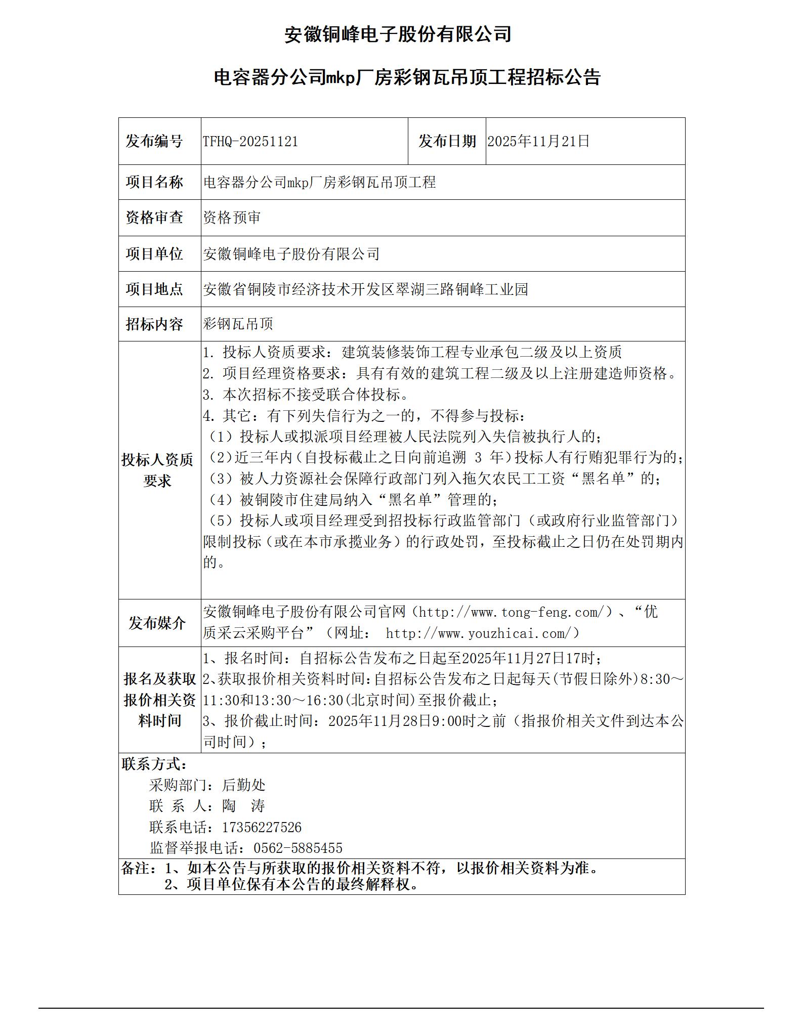 安徽旋乐吧SPIN8电子股份有限公司 (电容器分公司mkp厂房彩钢瓦吊顶工程 招标公告)_01