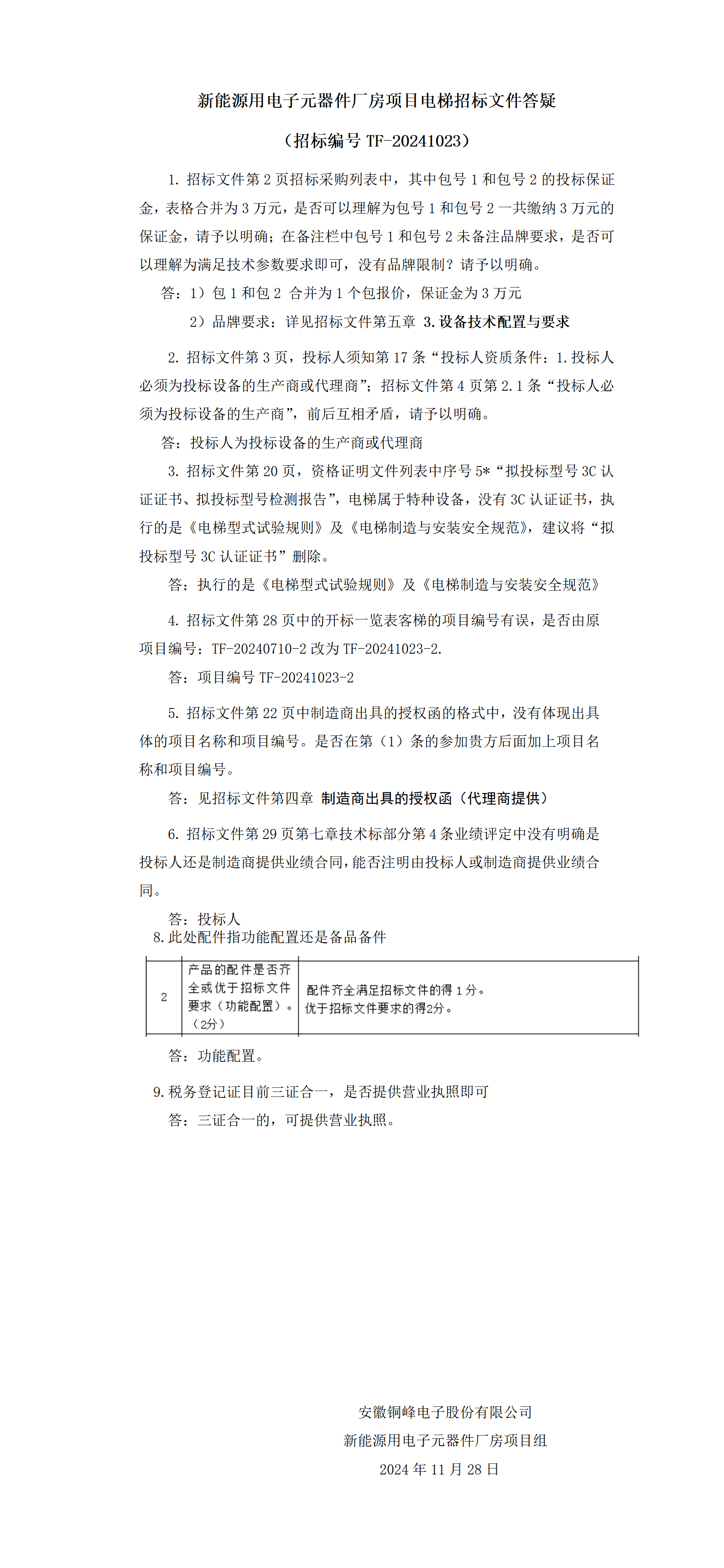 新能源用电子元器件厂房项目电梯招标文件答疑(招标编号TF-20241023)