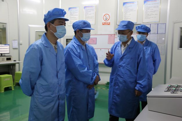 在电容薄膜分公司拉膜生产线,黄明强向胡启书一行汇报了公司生产经营、薄膜产品工艺流程以及重点项目建设情况。胡启书对公司的经营发展工作表示肯定,勉励企业把握市场机遇,加快项目建设,加强技术创新,促进企业高质量发展。