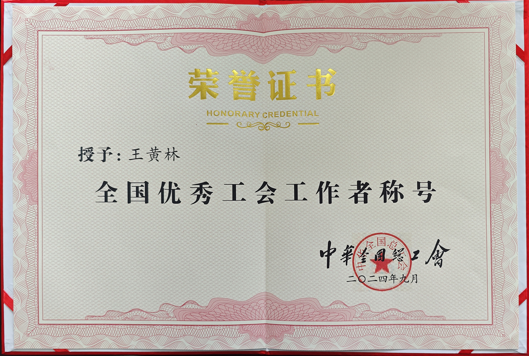 公司工会副主席王黄林荣获“全国优秀工会工作者”荣誉称号